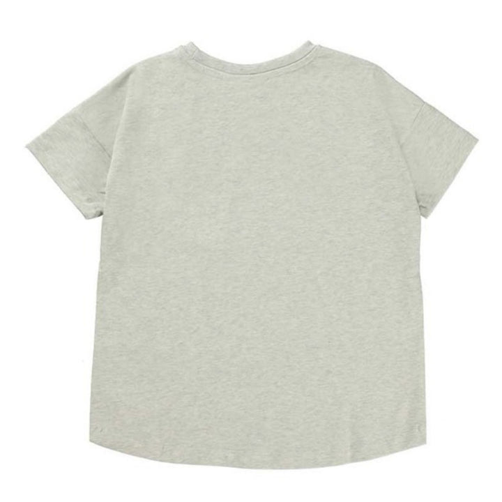 Cute grey marl T-shirt for girls by Molo, made in soft organic cotton jersey. Printed with an adorable kitten on roller skates printed on the front in a colourful garden, it has a relaxed crew neckline for casual wear.