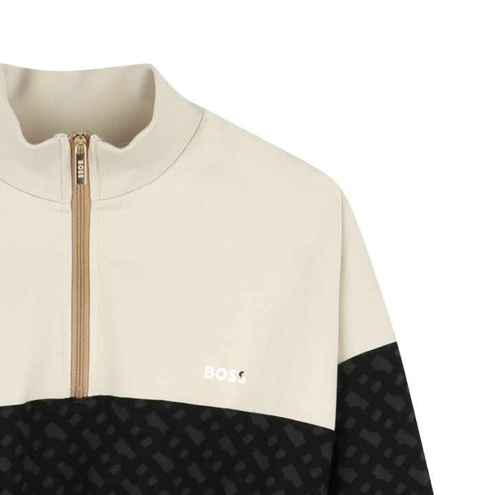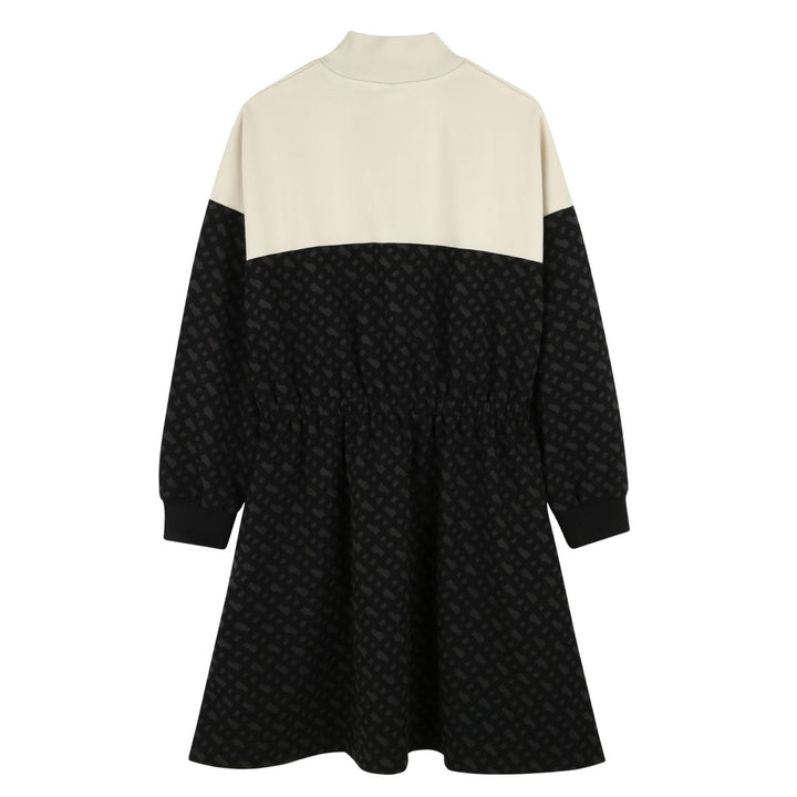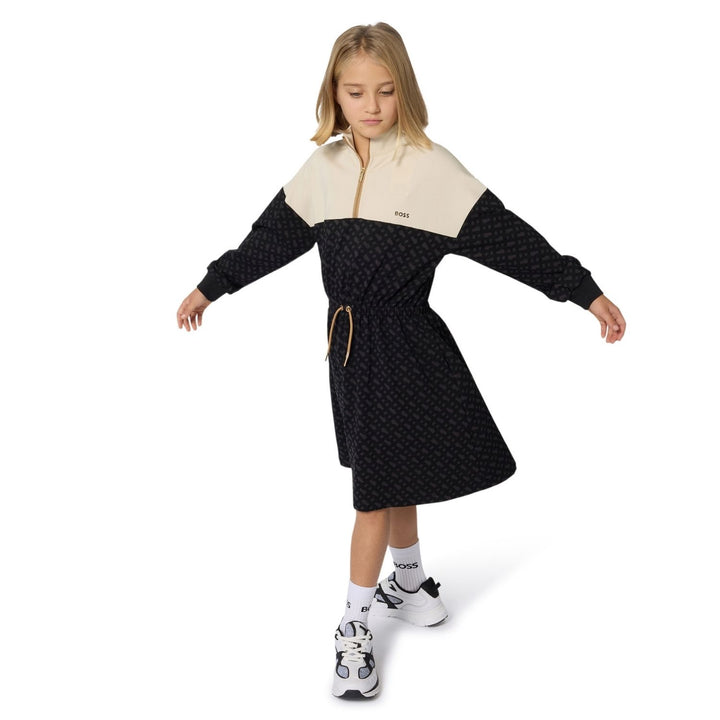 Ivory and black dress for girls by BOSS. Made from soft viscose with ivory panel, it features the brands monogram logo pattern. Finished with an elasticated waist and drawstring for comfortable fit.