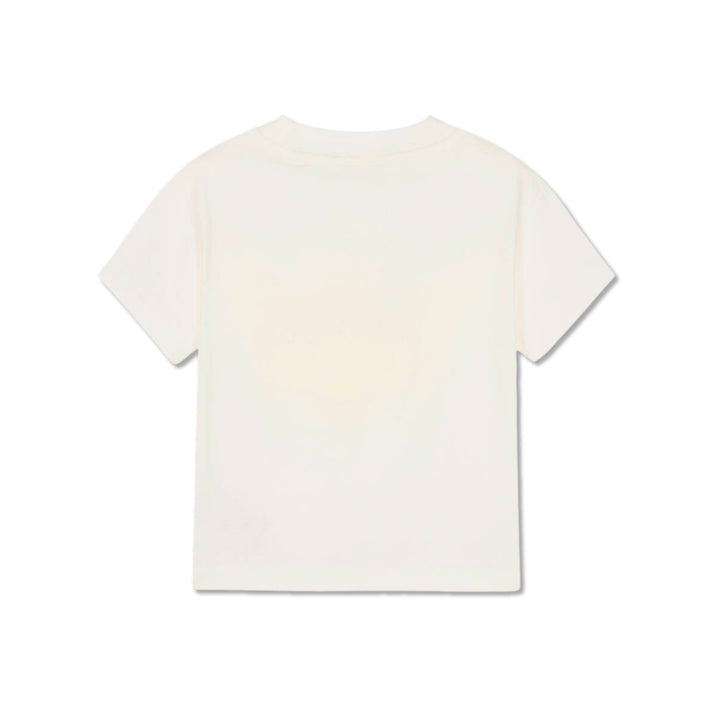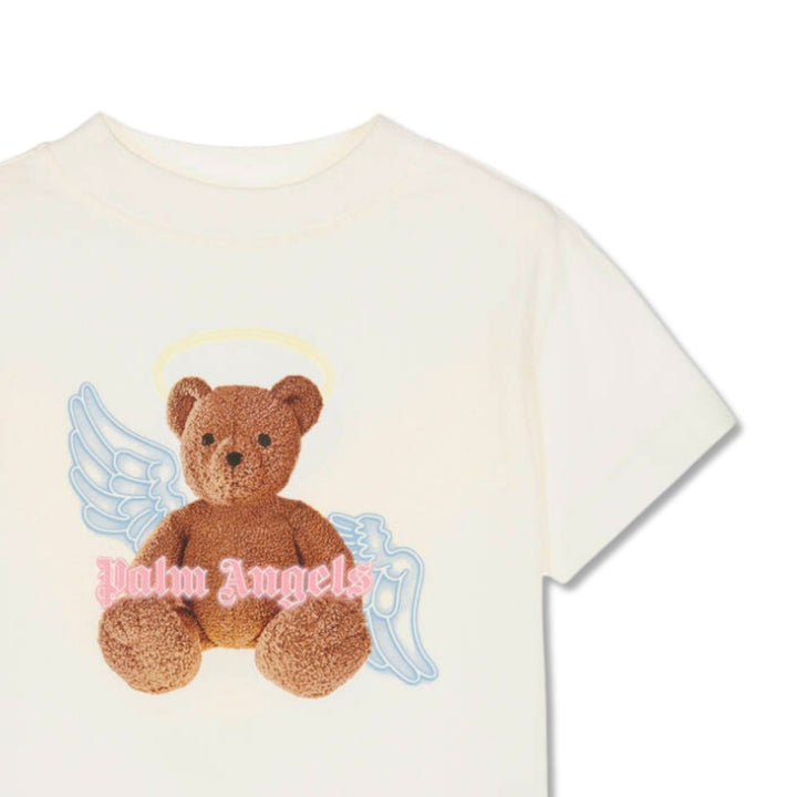 Ivory cotton T-shirt for girls from Italian contemporary brand, Palm Angels. This crew neck tee has a relaxed fit with dropped shoulders and short sleeves. The front has the iconic Bear graphic re-imagined with angel wings, halo and a pink neon light Palm Angels logo.