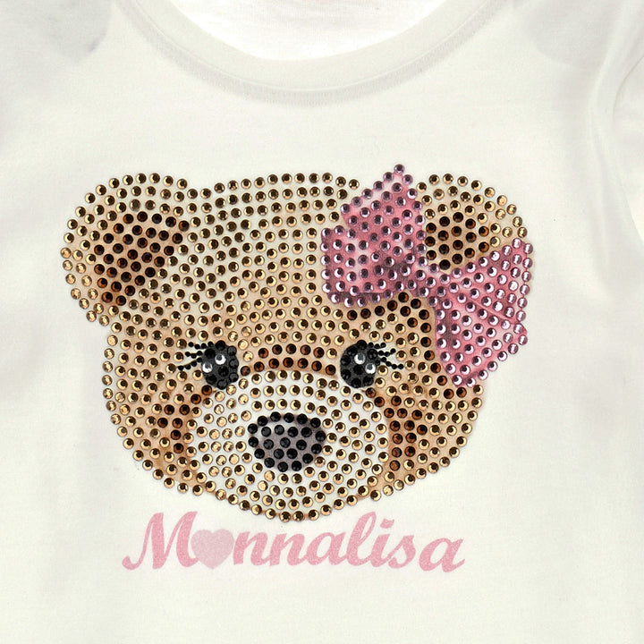 An ivory cotton T-shirt for girls from Italian designer Monnalisa. This wonderfully soft jersey top is designed with a cute beige and pink teddy bear print, sparkling with diamante. The labels script logo and heart are printed beneath to complete the