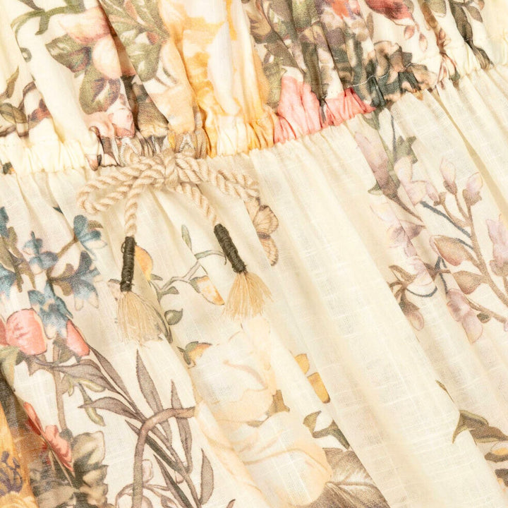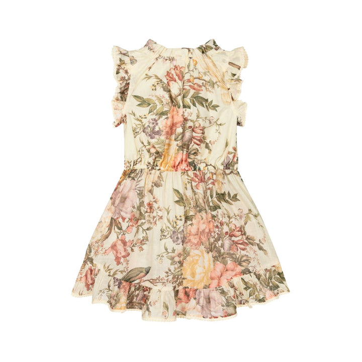 Pretty ivory dress for girls by Australian brand Zimmermann, made in soft, lightweight cotton. Cool and comfortable, it is ideal for warmer days. Patterned with a lovely floral and bird print in shades of green, purple, pink and yellow, it has a part