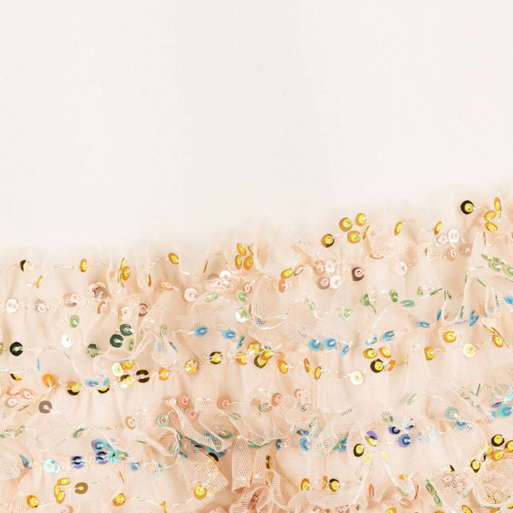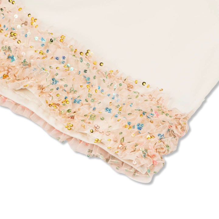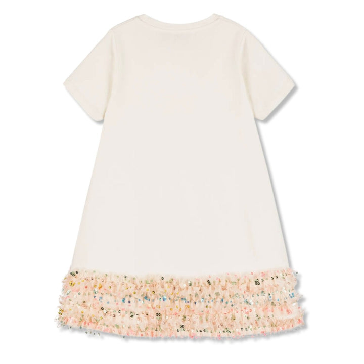 Ivory dress for girls by AIGNER, made in soft cotton jersey. In a simple, yet elegant design, this comfortable A-line shaped dress has a stylish handbag and logo motif on the front in glittery gold and pink. The hemline is trimmed with colourful sequinned ruffles that sparkle beautifully in the light.
