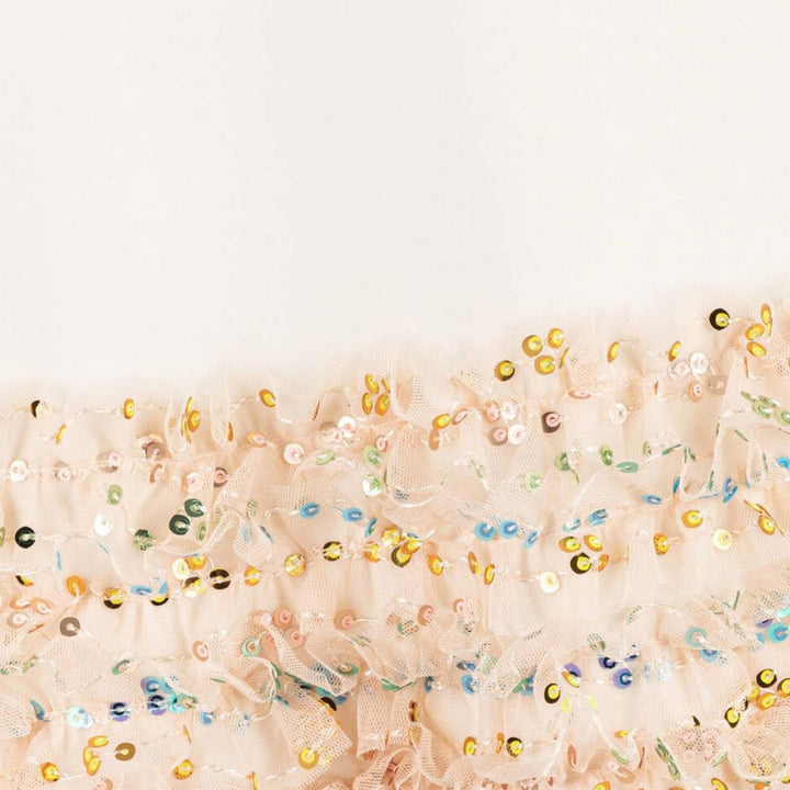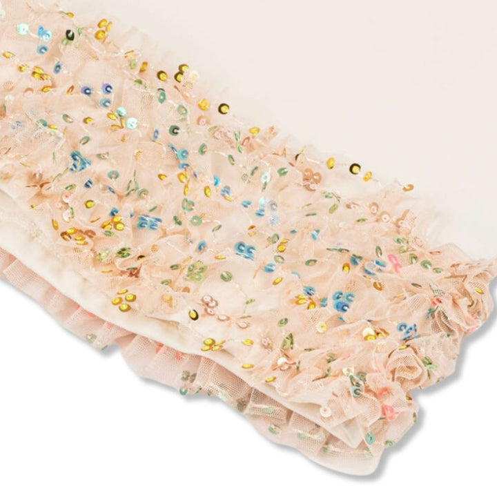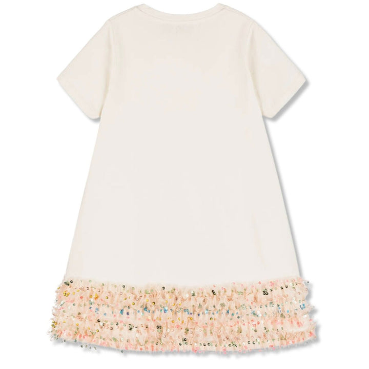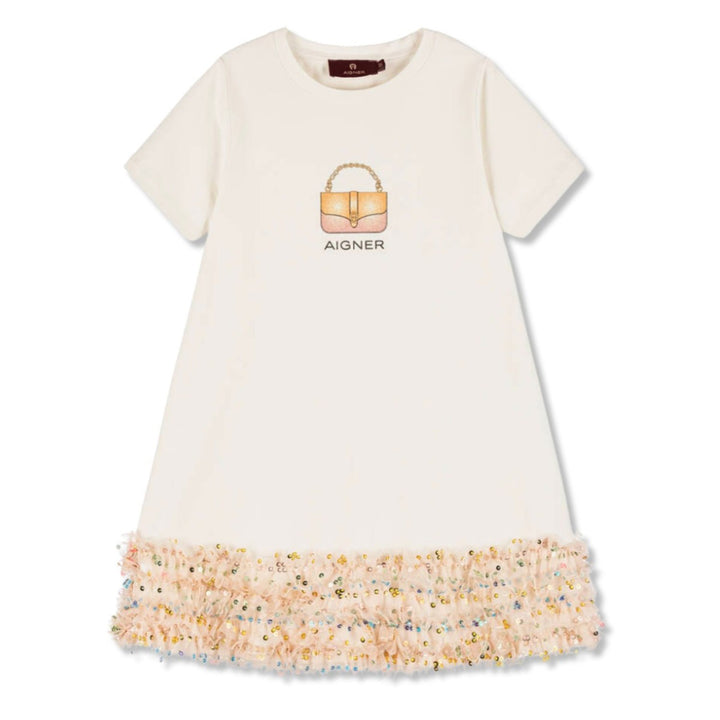 Ivory dress for girls by AIGNER, made in soft cotton jersey. In a simple, yet elegant design, this comfortable A-line shaped dress has a stylish handbag and logo motif on the front in glittery gold and pink. The hemline is trimmed with colourful sequ