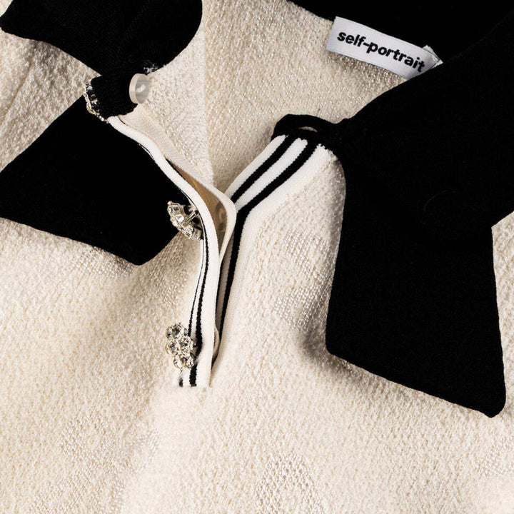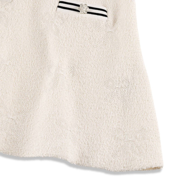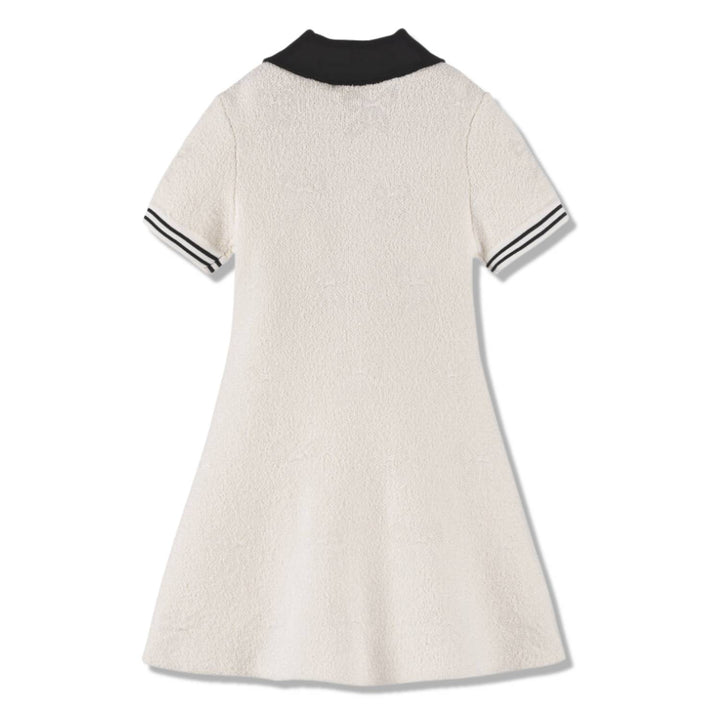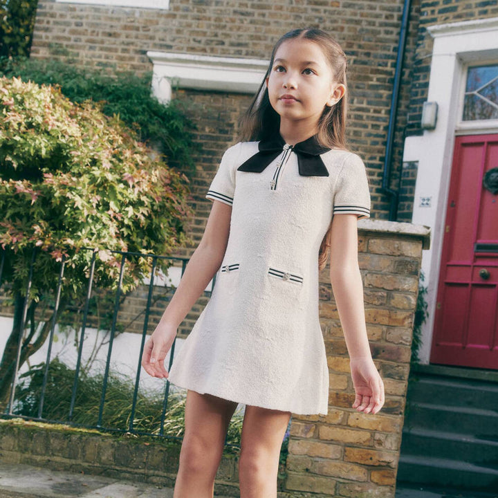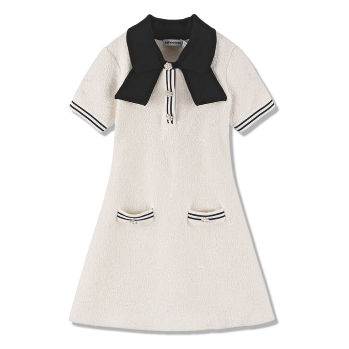 Lovely ivory dress for girls by Self-Portrait, knitted in a soft cotton blend with a pretty jacquard bow design. Classically styled, with a gentle A-line shape, it has a contrast black jersey collar styled to look like a bow and elasticated black and