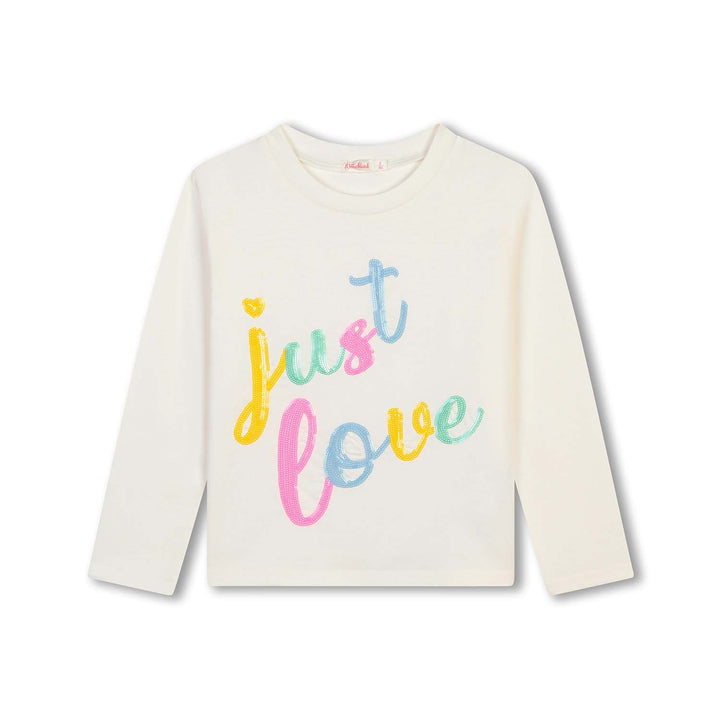 Designed by Billieblush for girls, an ivory long-sleeved t-shirt made in comfortable cotton jersey. Lightweight with a gently ribbed crew neckline, it has a colourful 'Just Love' sequin motif on the front for a stand-out look.