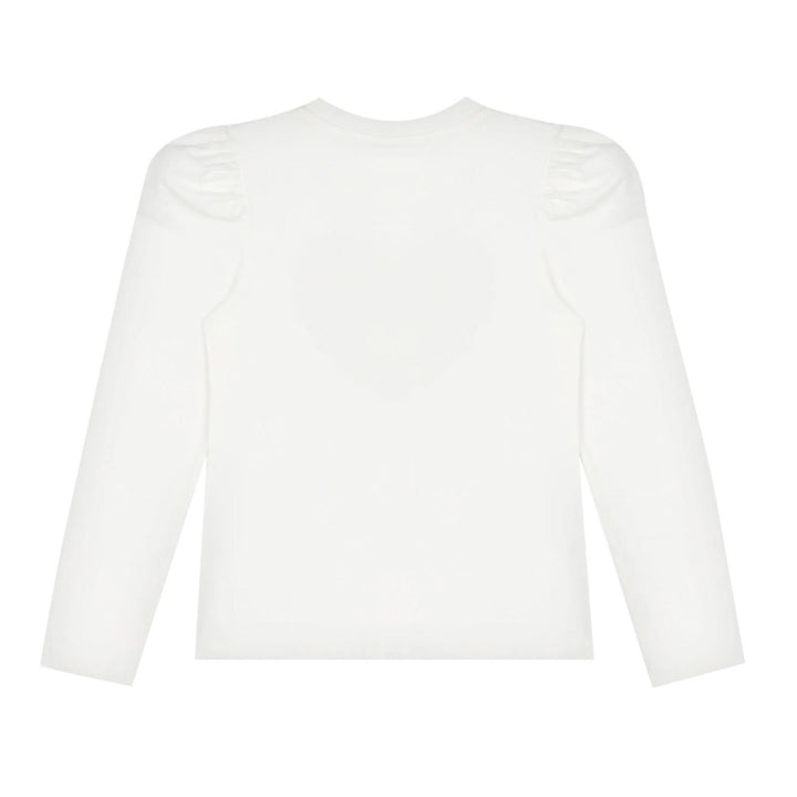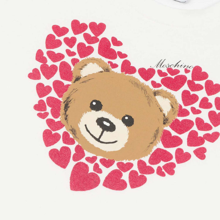 Cute ivory top for girls from Italian designer, Moschino Kid-Teen. Made in soft and comfortable cotton jersey, it is printed on the front with the Moschino Teddy Bear logo, together with a lovely red heart motif. For a stylish finish to this casual w