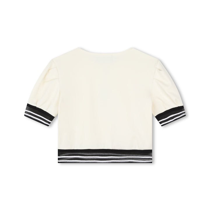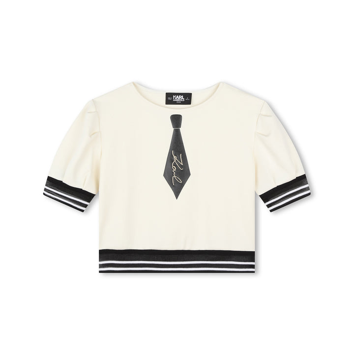 A ivory Top for girls by KARL LAGERFELD KIDS, made in soft and stretchy cotton jersey. This cool design has a printed black tie on the front, with a Karl Signature logo in shimmering gold embroidery. It is styled in a boxy fit, with gently puffed sle