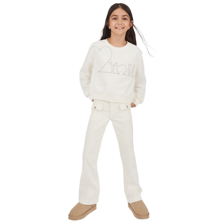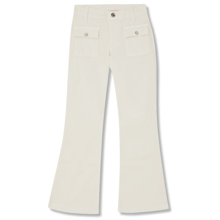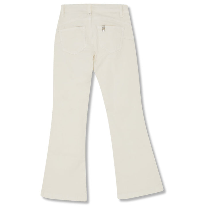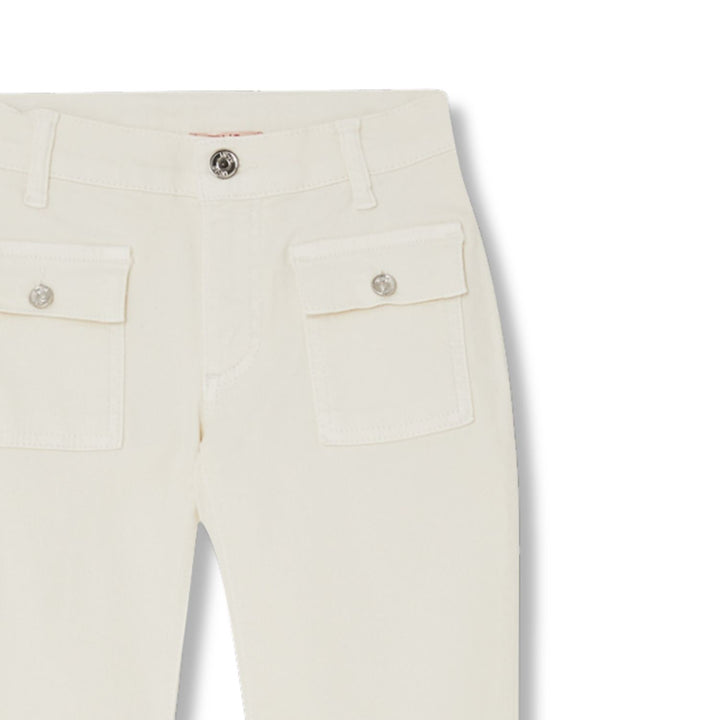 These ivory jeans feature a stylish flared-leg silhouette with flap pockets and button accents on the front, adding a chic retro touch. Crafted from soft and stretchy cotton fabric, they offer a comfortable fit perfect for casual outings or stylish e