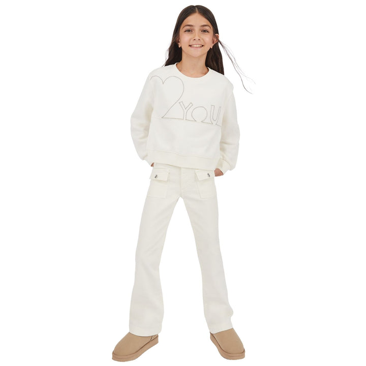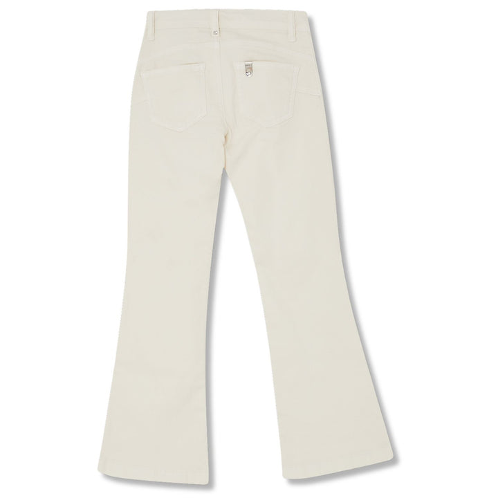 These ivory jeans feature a stylish flared-leg silhouette with flap pockets and button accents on the front, adding a chic retro touch. Crafted from soft and stretchy cotton fabric, they offer a comfortable fit perfect for casual outings or stylish everyday wear.