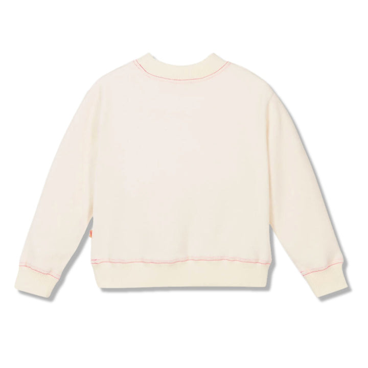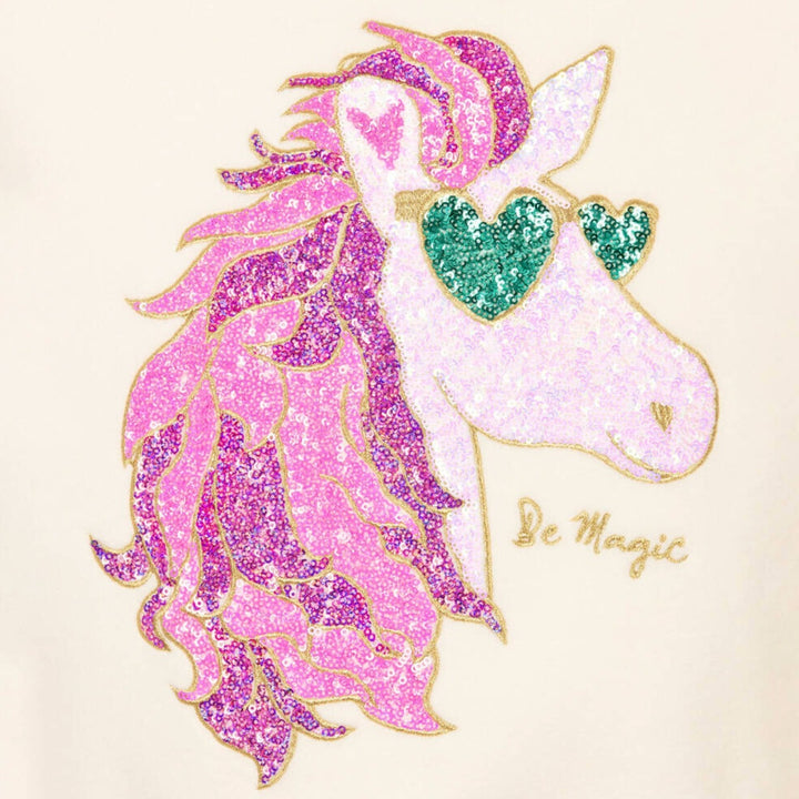 Cosy and warm, this ivory long-sleeved sweatshirt for girls by Billieblush is made from soft cotton-blend fleece. Stitched on the chest is a striking pink sequinned unicorn design, with green heart-shaped sunglasses and 'Be Magic' embroidered in gold below. The shimmery ribbed high neckline, hemline, and cuffs have contrasting neon pink topstitching and there is a striped branded tab on one side seam for a distinctive finish.