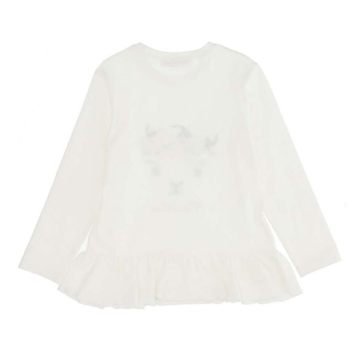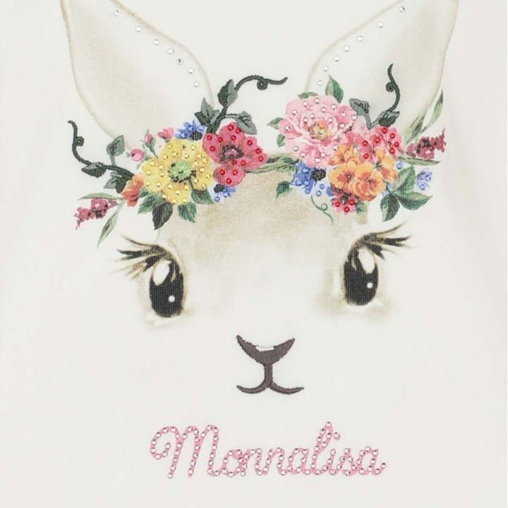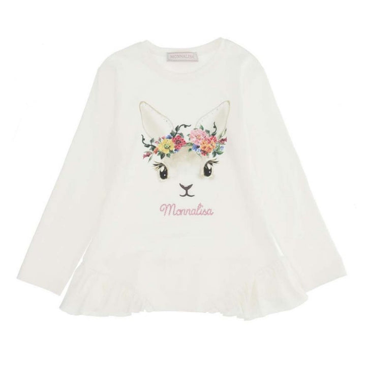 Cute ivory top for girls by Italian designer Monnalisa, made in comfortable cotton jersey. It has a bunny print on the front with a floral head dress, sparkling with diamantés. There is a pink diamanté logo below and a ruffled hemline.