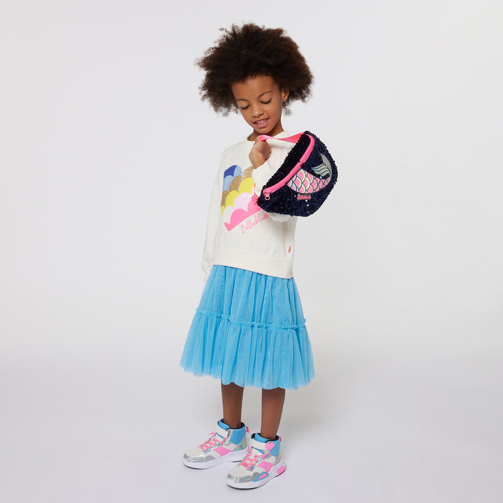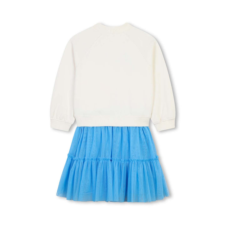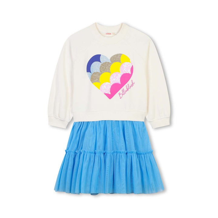 Casual ivory and blue dress for girls by Billieblush, with the look of a two piece. The sweatshirt style top part has a colourful heart printed on the front, embellished in glitter and iridescent sequins. It is made in soft, comfortable jersey, with