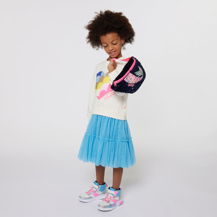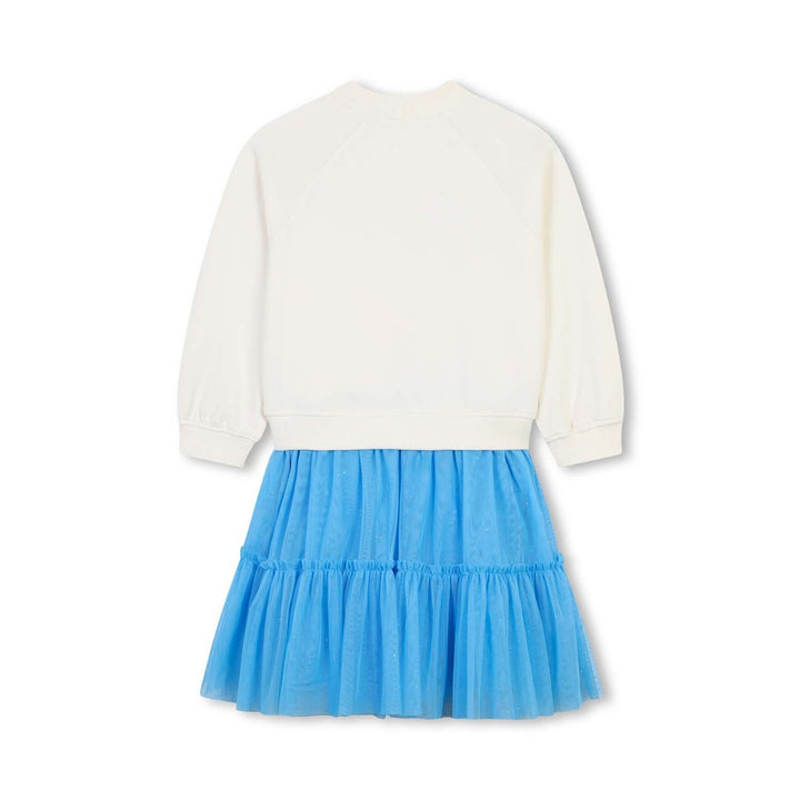 Casual ivory and blue dress for girls by Billieblush, with the look of a two piece. The sweatshirt style top part has a colourful heart printed on the front, embellished in glitter and iridescent sequins. It is made in soft, comfortable jersey, with cosy, ribbed trims on the long, raglan sleeves. The skirt is made in layers of glittery blue tulle with a ruffle around the hemline and a lightweight, jersey lining for comfort. Easy to wear, it simply pulls on over the head.