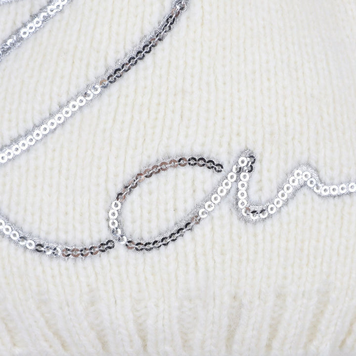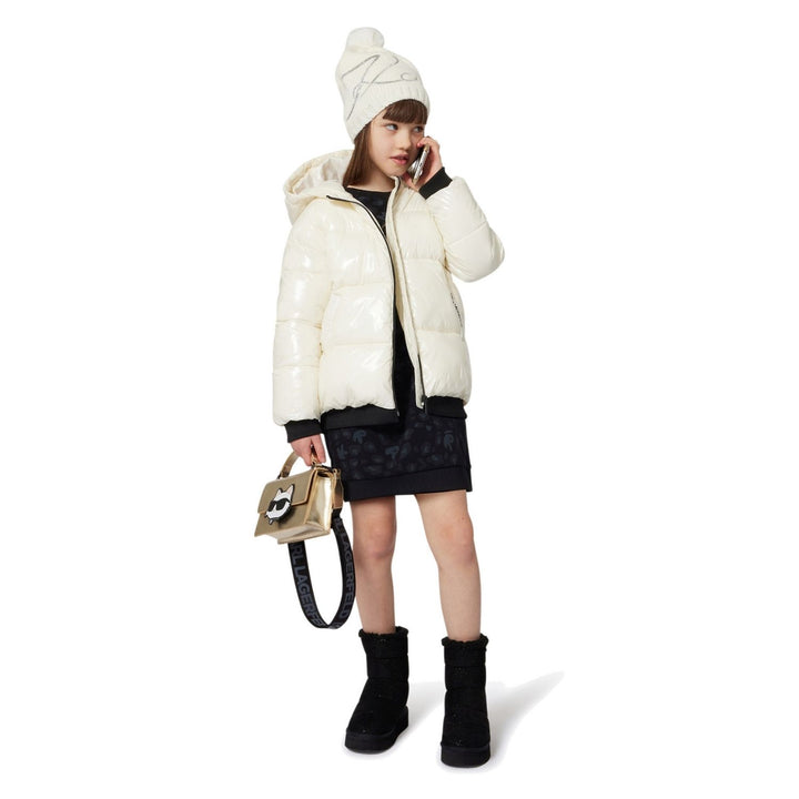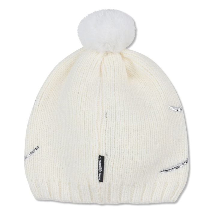 Girls ivory beanie featuring a cute Karl logo print and topped with a soft pompom for a cozy, stylish finish.