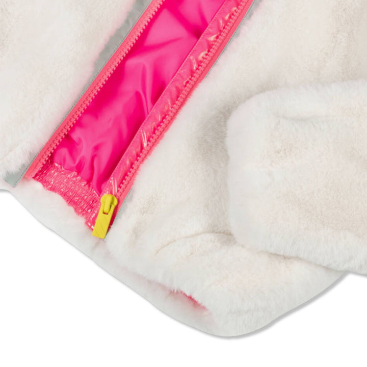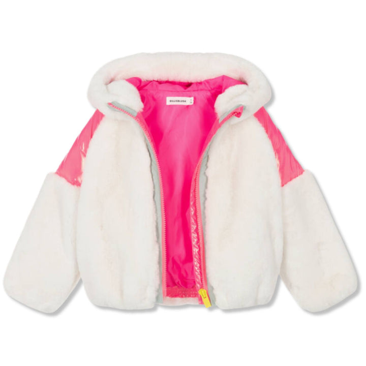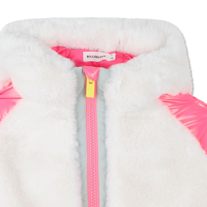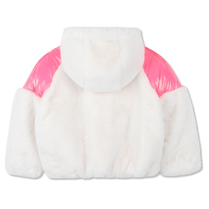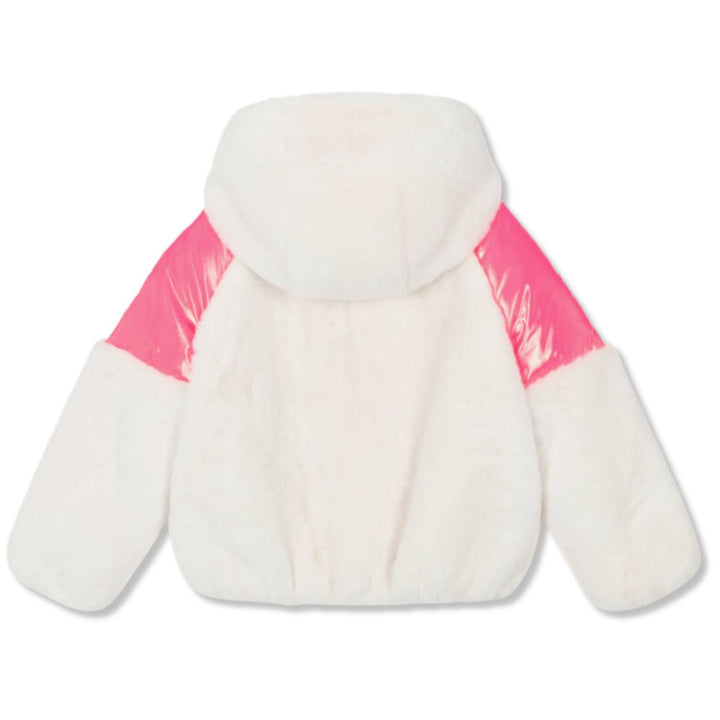 ivory jacket for girls by Billieblush, made in super soft faux fur. Warm and cosy, with side seam pockets and an elasticated hem, this padded and hooded jacket features striking silky, smooth trims on the shoulders in the brand's signature neon pink.