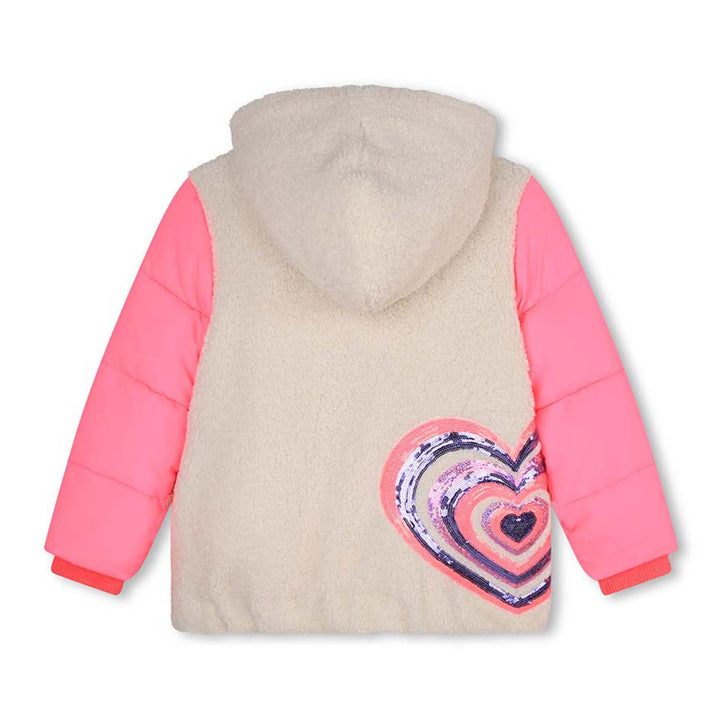 Girls neon pink and ivory hooded jacket by Billieblush, great for everyday wear. This stylish jacket is padded for warmth and has a lightweight lining, with two handy front pockets. The jacket fastens with an exposed zip on the front and the elastica