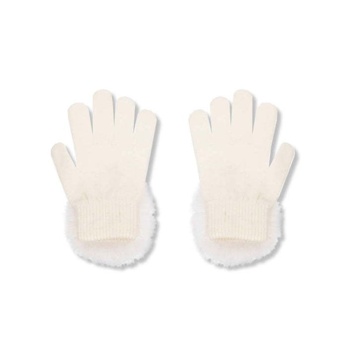 Glamorous ivory gloves for girls by Monnalisa, made from a soft knit. Beautifully decorated with silver diamanté snowflake detailing, they have large white fluffy wool pom-poms on the wrists that detach with poppers to make washing easier. Warm for the cooler weather, they will add an enchanting touch to any outfit.