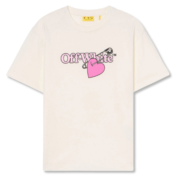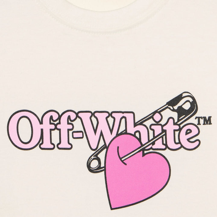 Ivory cotton T-shirt for girls by Off-White, featuring a striking pink pop heart logo graphic on the front with bold brand lettering. This casual style is made in soft jersey with dropped shoulders, offering comfort and style for everyday wear.