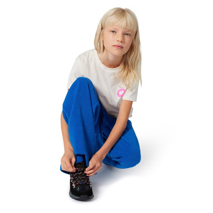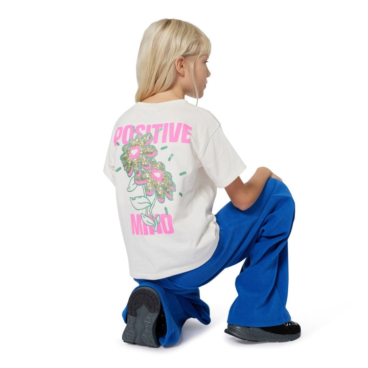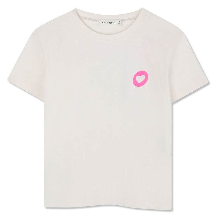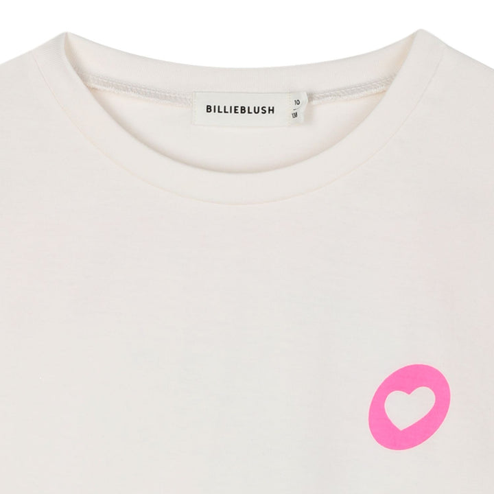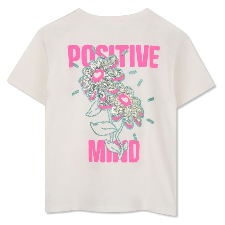 Ivory T-shirt for girls by Billieblush, made in soft cotton jersey. Cool and comfortable, this casual tee features a charming heart motif on the front and a neon pink, floral Positive Mind graphic on the back decorated with gold sequins and green gli
