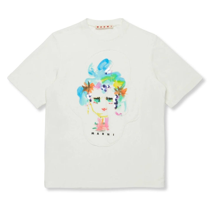 A versatile staple with a touch of charm, this white cotton T-shirt from Marni Kids features delicate applique detailing on the front. Designed with a classic crew neck, short sleeves, and a straight hem, it offers both comfort and effortless style. Crafted from 100% soft cotton, its perfect for everyday wear.