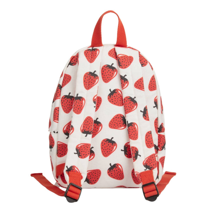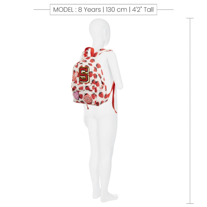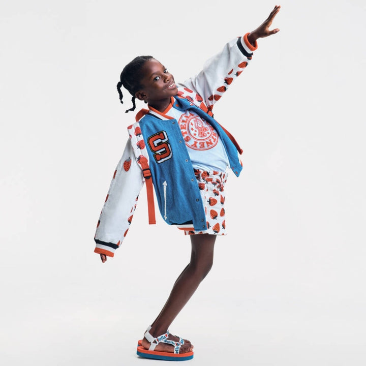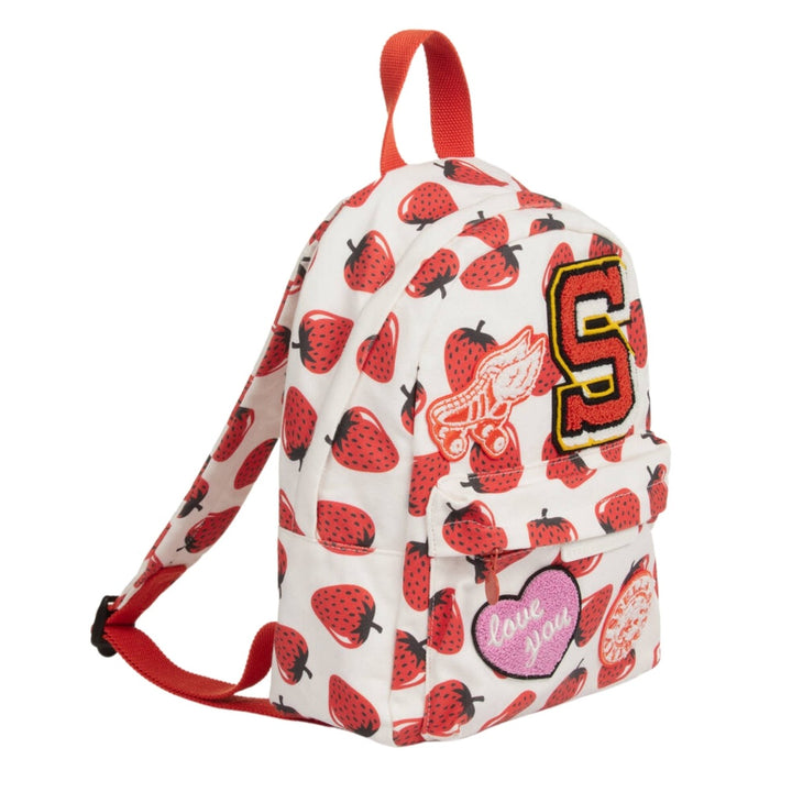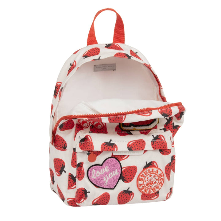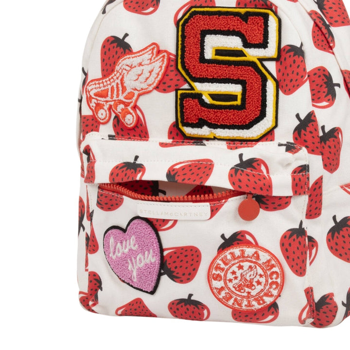 Ivory backpack for girls by Stella McCartney Kids, patterned with bright red strawberries. Fastening with branded zips, this practical design has a spacious main compartment and a smaller front pocket. It has adjustable shoulder straps and varsity-style appliques on the front with textured boucle detailing.