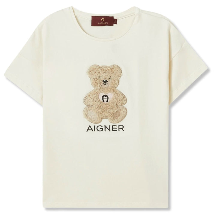 Sweet and stylish, this ivory T-shirt features a charming teddy bear logo patch that adds a playful touch. Crafted from a soft cotton blend with a hint of stretch, it ensures all-day comfort perfect for casual wear with a cute and cozy flair.