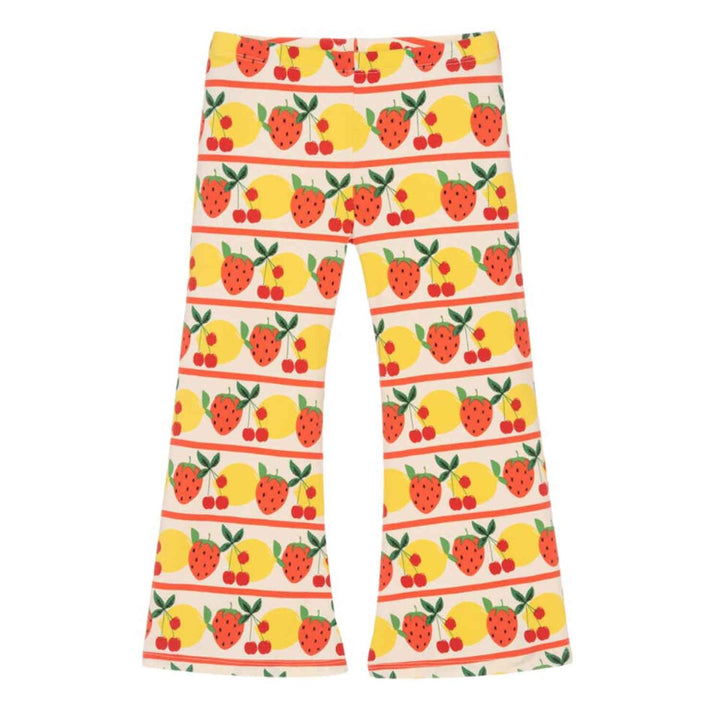 Fun ivory leggings for girls by Swedish brand Mini Rodini, made in soft and stretchy organic cotton. They are patterned in a colourful red and yellow fruit design, with delicious strawberries, cherries and lemons. These trousers are gently elasticate