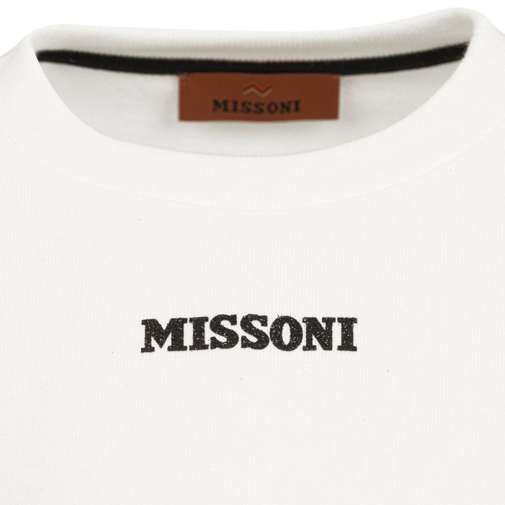 Girls ivory sweatshirt by Missoni featuring the brands iconic multicolor zig-zag pattern across the front, crafted from soft cotton with ribbed trims for a cozy yet stylish casual look.
