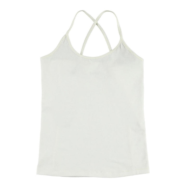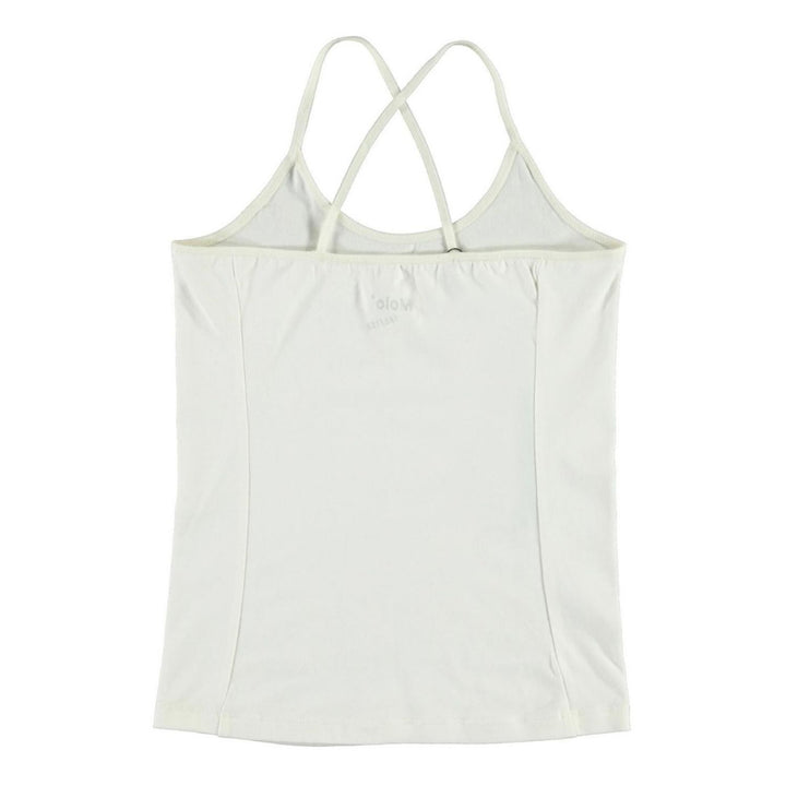 Janis is a white cotton vest with crossed straps on the back. It comes in a small, fabric bag. This Molo product is GOTS certified organic, which means that it is made with certified organic materials and produced under the strictest social and envir