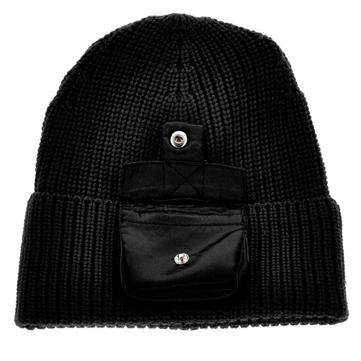 Stylish knitted black beanie hat for girls by Monnalisa. It has a unique satin pocket on the turned-up brim, styled with a sparkling gold and silver diamante M logo charm for added glamour.