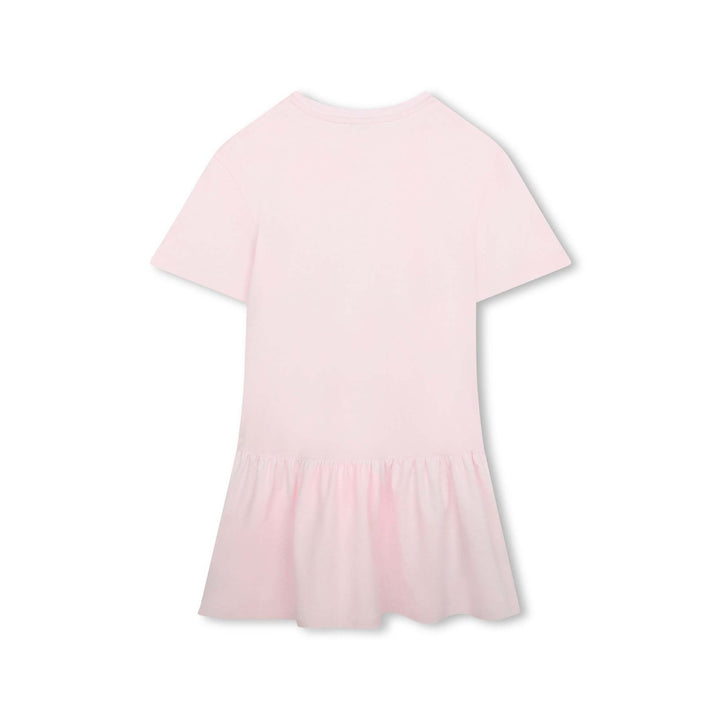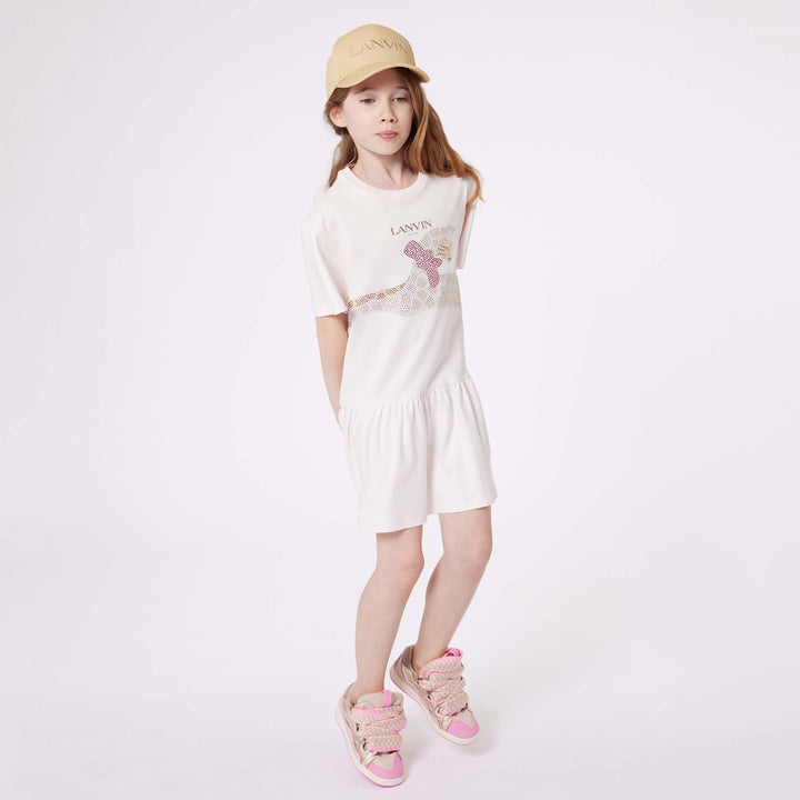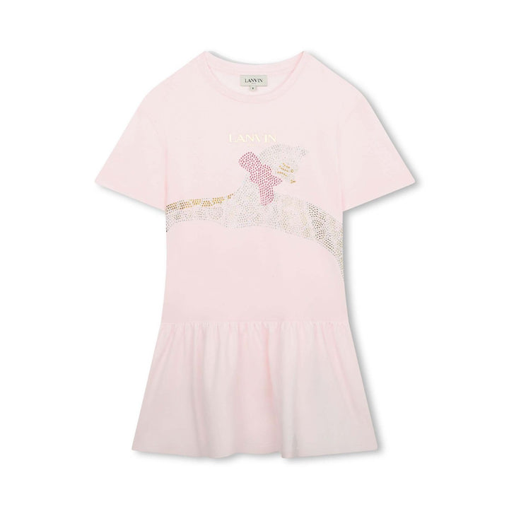 Beautifully combining comfort and style, a light pink dress for girls by French label, Lanvin. Made in soft organic cotton jersey, this easy-to-wear design has a pink signature logo print on the chest with chic rhinestone studs.