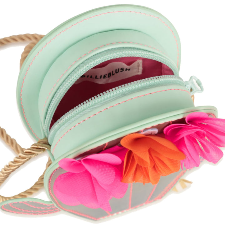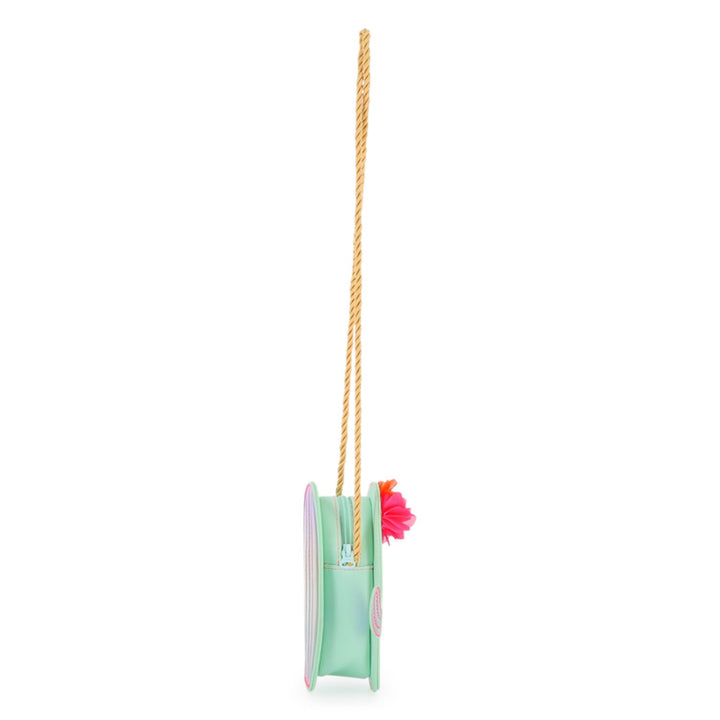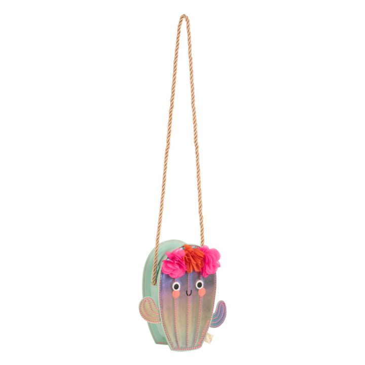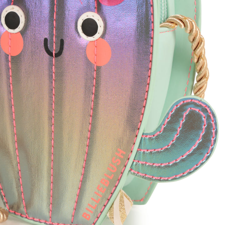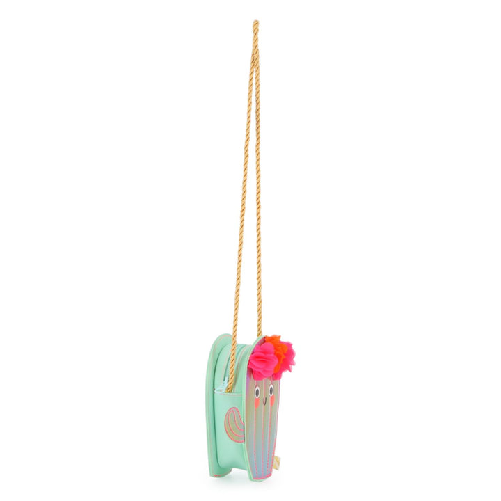 This playful crossbody bag by Billieblush is designed in the shape of a cactus, featuring a shimmering iridescent finish and vibrant 3D floral accents on top. Cute stitched details, big smiling eyes, and a rope strap make it a fun and standout access