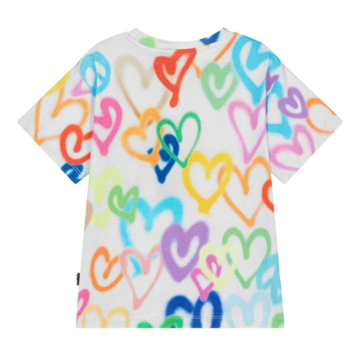 Patterned in multicolour hearts with a spray paint effect, this white short-sleeved T-shirt for girls is by Danish brand Molo. Casual and comfortable, it is made in organic cotton jersey, with a crew neckline. A logo tab on the side seam adds a subtl
