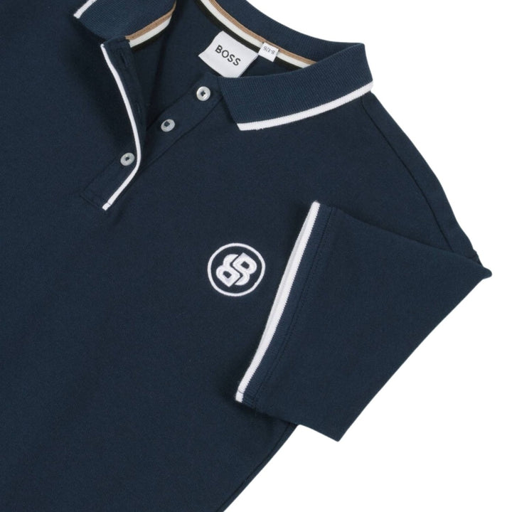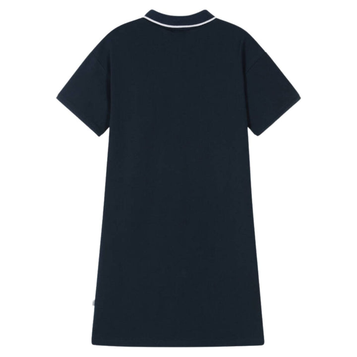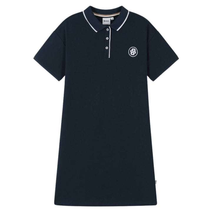 Navy blue polo dress for girls by BOSS, made in soft cotton pique. Cool and comfortable, it has short sleeves and a split hem for ease of movement. This classic style has white trims and button fastenings on the front. There is a white embroidered Double B monogram logo on the front and signature striped trim inside the neck for a subtle branded finish.