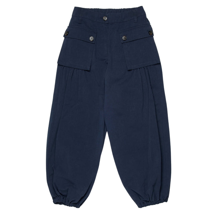 Balloon fit cargo pants in cotton blend drill. Elastic at the ankle. Tone-on-tone embroidered MAX&Co. logo on one of the side pockets. Reflections on the front that give volume to the garment. Waist and pocket closures with logoed buttons.