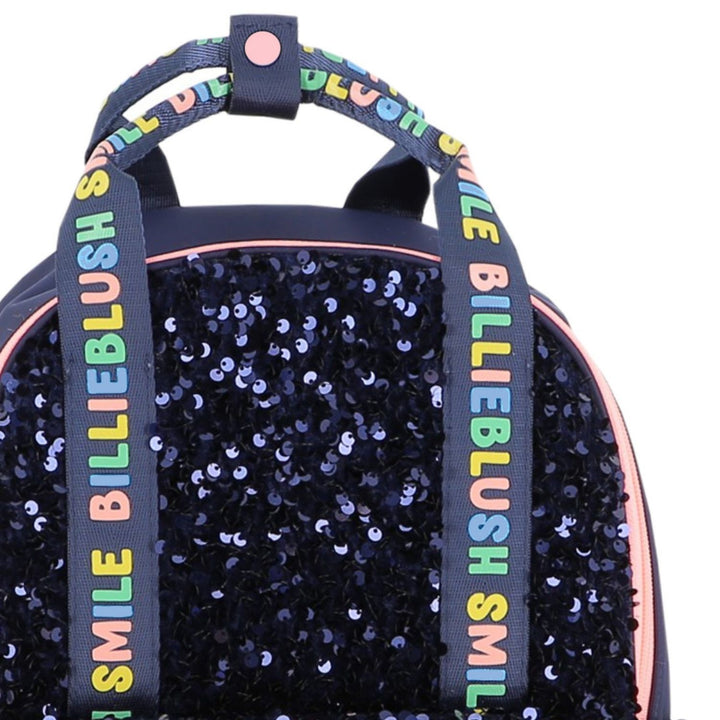 Fun navy blue backpack for girls by Billieblush, with sparkly sequins in blue and iridescent pink. The practical design includes a spacious main compartment, a front zip pocket and useful side pockets, ideal for everyday essentials. It has useful car