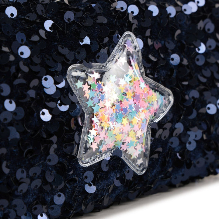 Navy blue pencil case for girls by Billieblush, with dazzling sequins and a playful star appliqué. Both fun and functional, it has a spacious zipped compartment and a webbed carry handle printed with a colourful repeat logo.