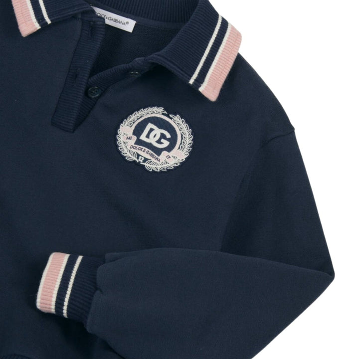 Navy blue dress for girls by Dolce & Gabbana, made in soft mid-weight cotton jersey. This casual style has long sleeves and a polo-style collar, with striped ribbed trims in pink and white. There is a crest logo motif on the chest for a distinctive brand finish. The elasticated waistband adds a touch of structure, while the skirt is softly gathered for a pretty look.