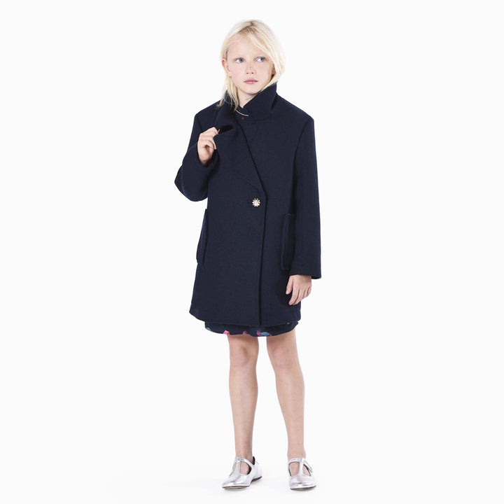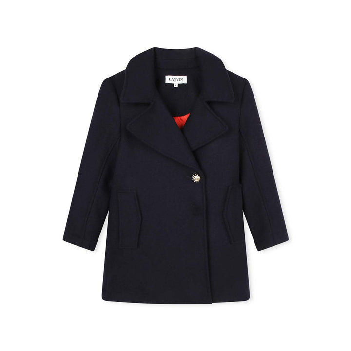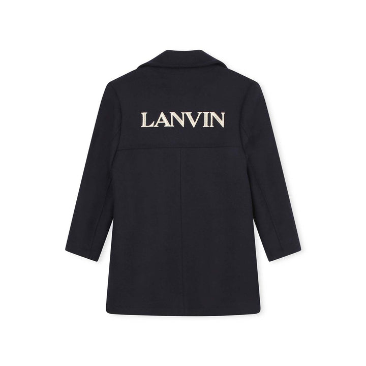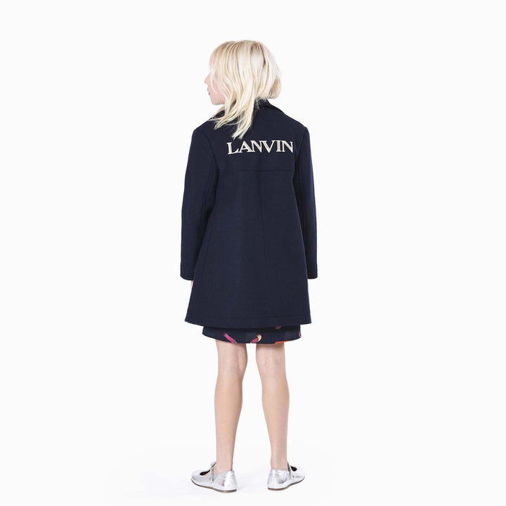 Navy blue coat for girls by Lanvin, woven in a luxurious wool blend. Classic yet effortlessly modern, this smart double-breasted coat has a gold diamanté-embellished button fastening. The brand's signature logo is embroidered on the back in metallic