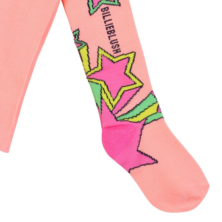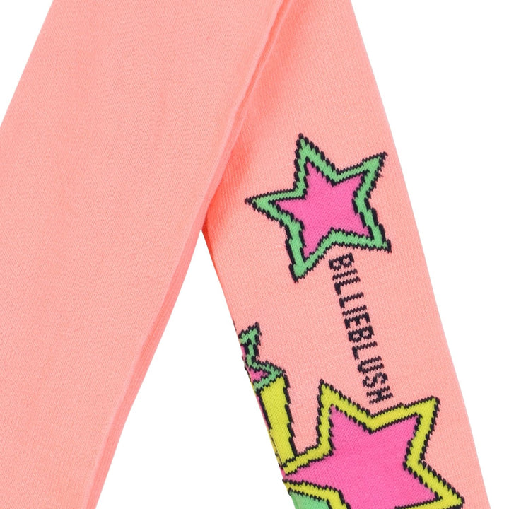 Girls neon orange tights by Billieblush, featuring a bold, shooting star intarsia on the ankles in bright pink, yellow and green, as well as a logo. Soft and stretchy, they are ideal for adding both a touch of fun and brand appeal to any outfit.