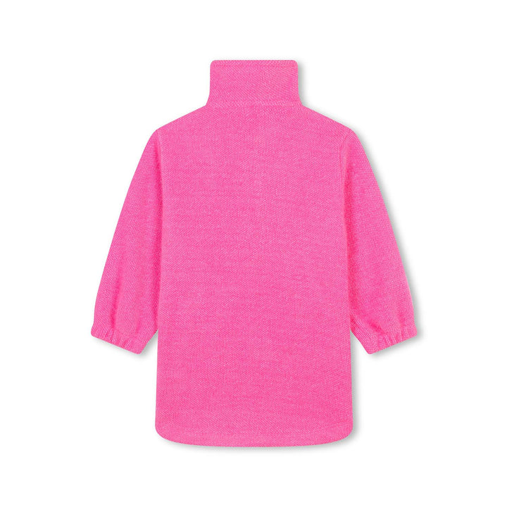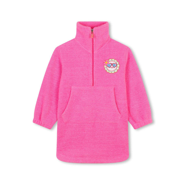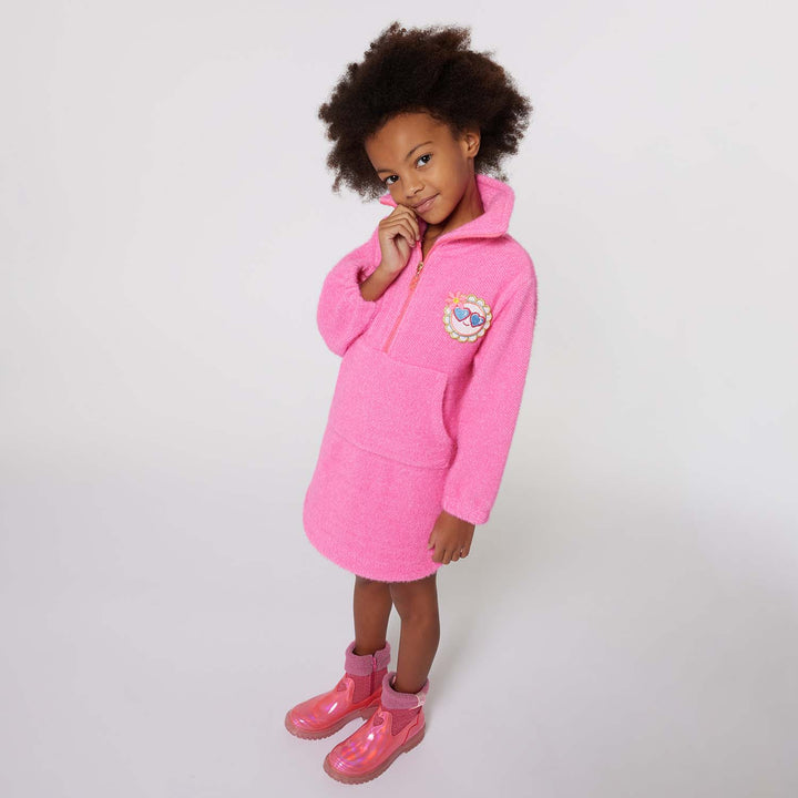 Super soft and fluffy, this neon pink dress for girls by Billieblush has an embroidered, glittery flower badge on the front. Made in a mid-gauge knit, it has a zip-up collar, a useful pouch pocket and a logo tab on one side seam. The long sleeves hav
