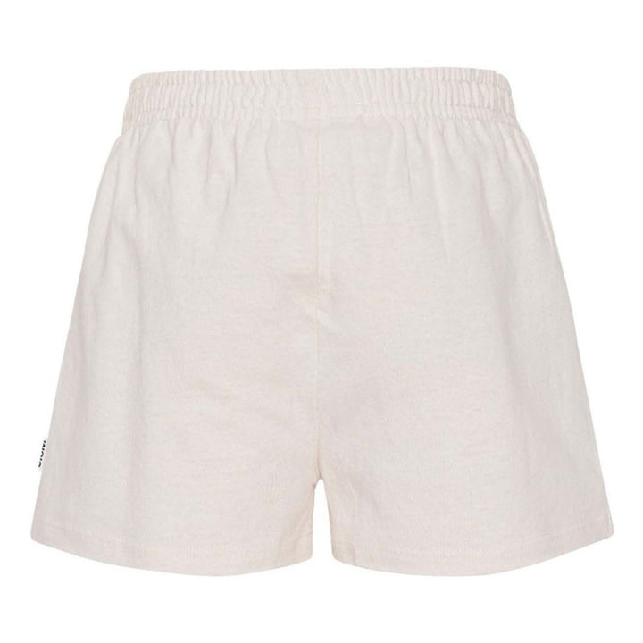 Girls Off-white cotton shorts in a small print of pink hearts. The shorts are in a sporty, loose-fitting look and have an elastic waist.