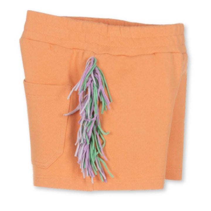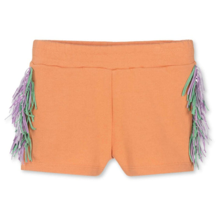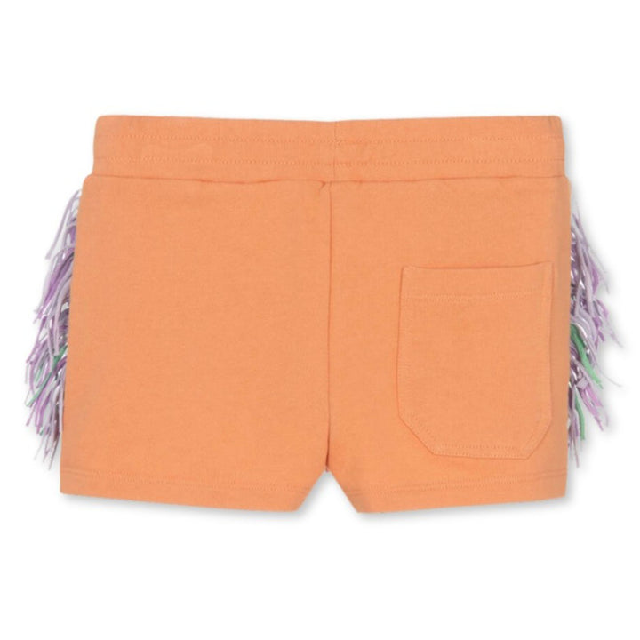 Made in cotton jersey these fun and playful orange shorts for girls are by Stella McCartney Kids. Casual and comfortable, they have purple and green fringing on the sides of the legs, concealed side seam pockets and a gently elasticated waistband. Th