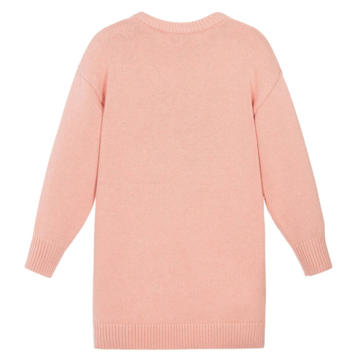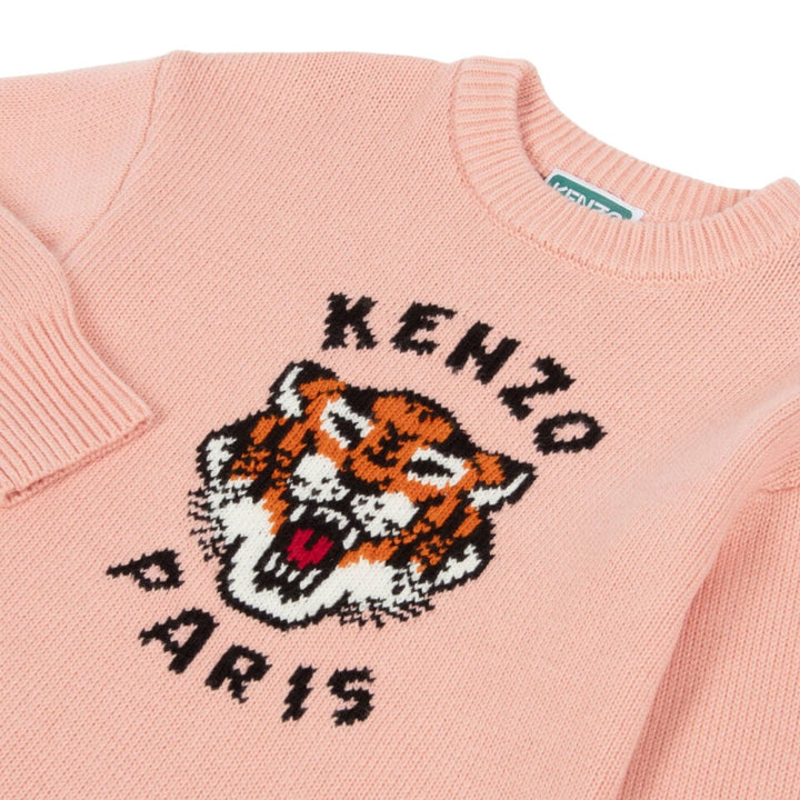 Pale pink knitted dress for girls by KENZO KIDS, with the luxury French label's striking Lucky Tiger design on the front. Knitted in a soft cotton and wool blend, this stylish jumper dress ensures comfort and warmth. Its relaxed fit and ribbed cuffs