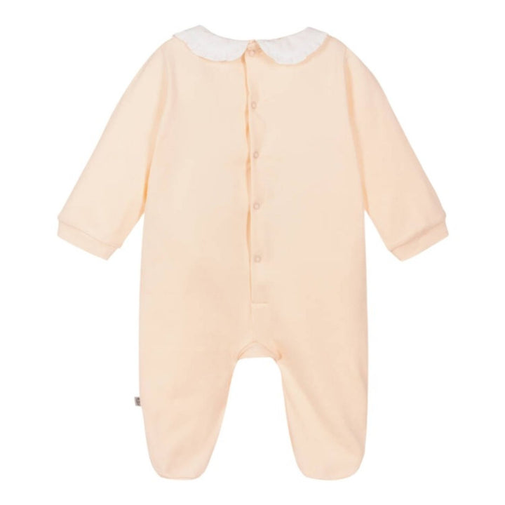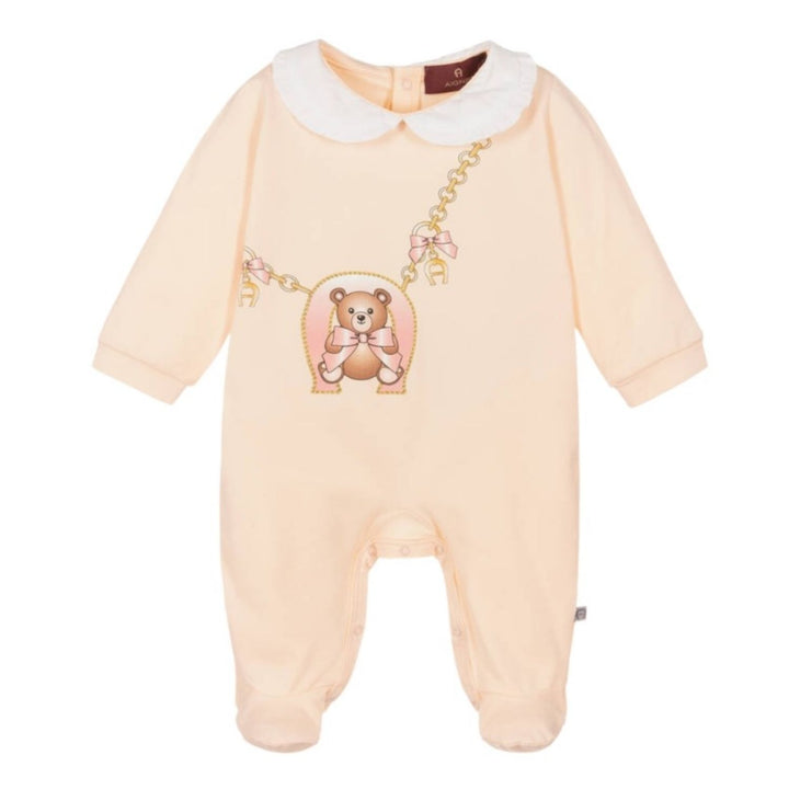 Peach Pima cotton babygrow for girls by luxury designer AIGNER, made in super soft jersey. It features a cute bear and chain pattern, with the brand's signature 'A' horseshoe logo in pink. It has popper fastenings on the back and between the legs to