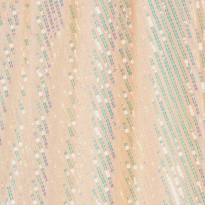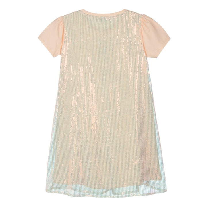 Peach cotton dress for girls by AIGNER, with a pink tulle overlay shimmering with sequins. Made in comfortable, stretchy jersey, it has pretty puffed sleeves and has the brand's large signature 'A' horseshoe logo on the chest. Easy to wear, it simply