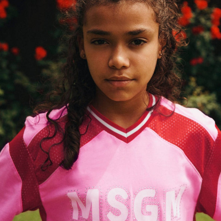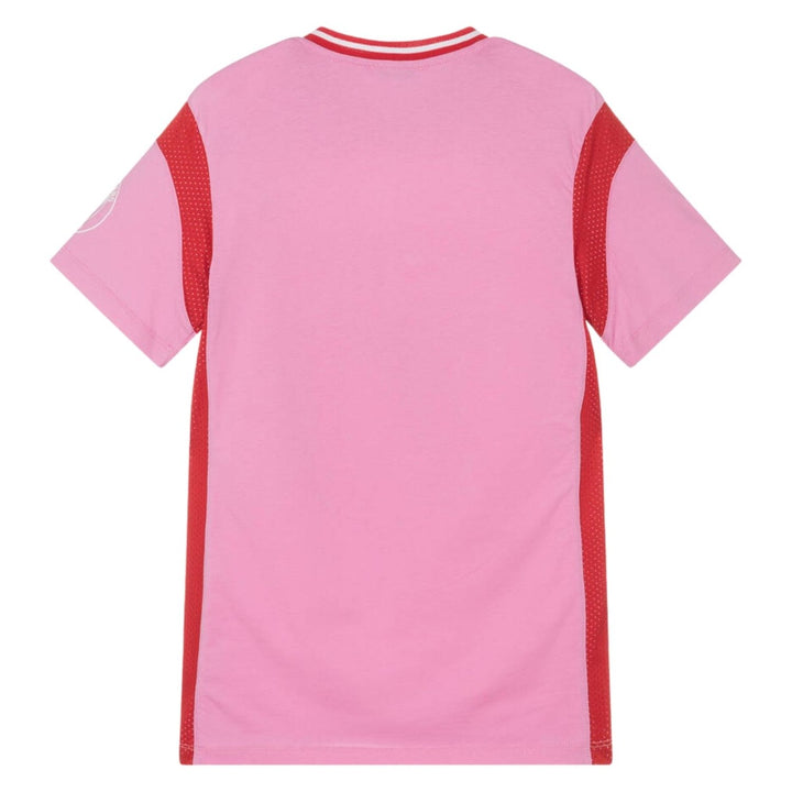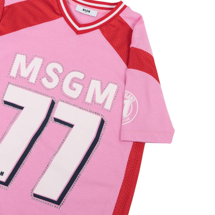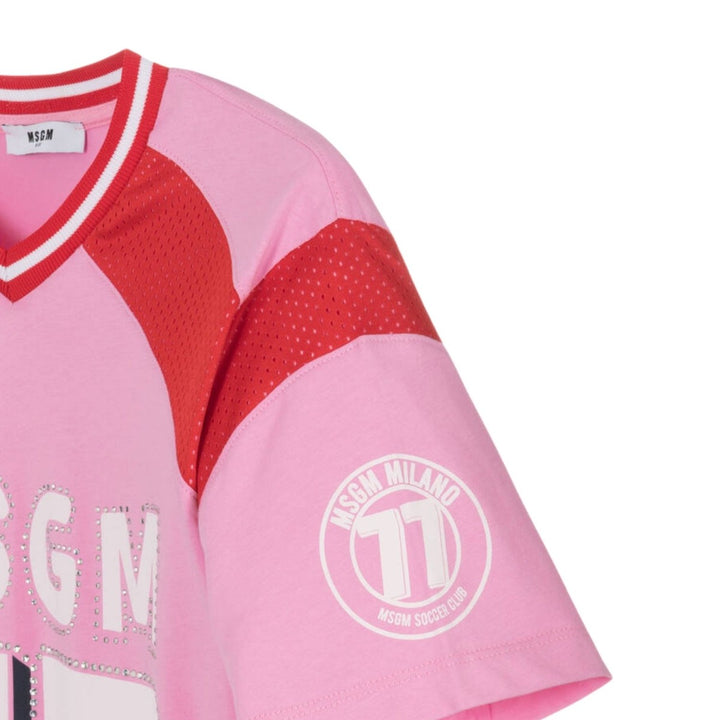 A cool and sporty look for girls, this pink cotton dress from MSGM in made in comfortable cotton jersey. Soccer-inspired, it has red mesh trims and stripes on the ribbed V-neck. There are logo prints on the sleeve and front, with diamantes for a sparkly finish.