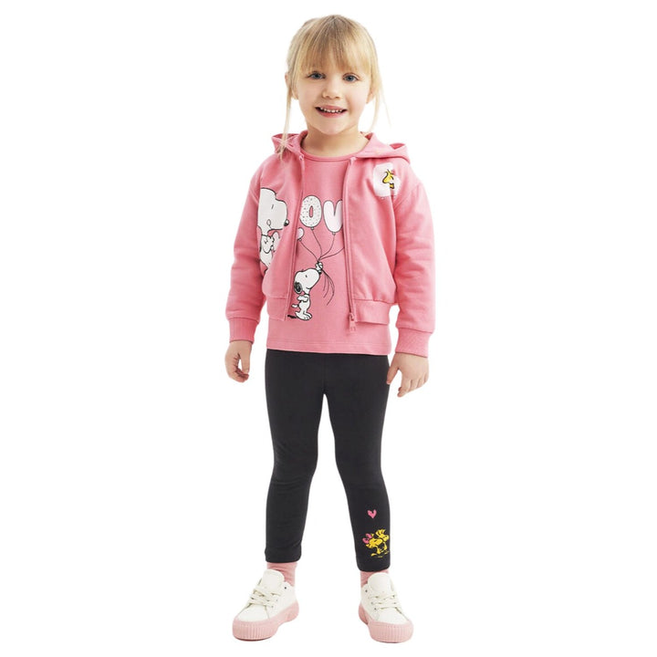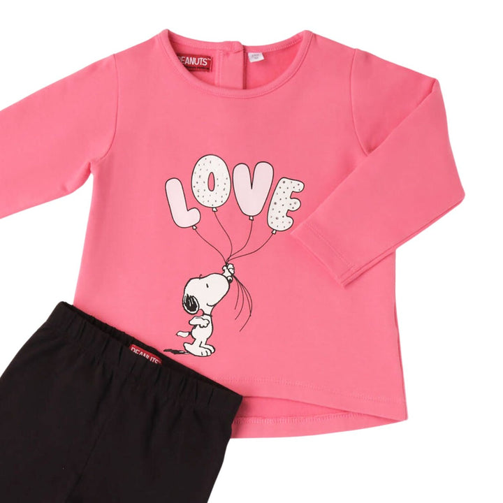 Made from a soft blend of 95% cotton and 5% viscose, this girls pink and black outfit features a playful Snoopy love print that adds a fun, cheerful touch. Comfortable and lightweight, it is perfect for casual wear, playdates, or relaxed outings.