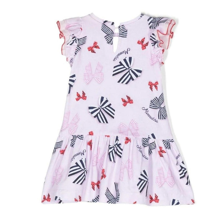 bow-print jersey T-shirt dress from MONNALISA featuring multicolour, stretch-cotton, jersey knit, panelled design, all-over logo print, bow print, ruffled trim, round neck, rear button fastening, short sleeves and straight hem.