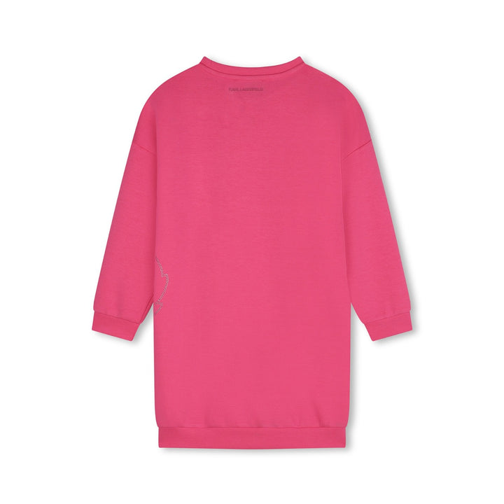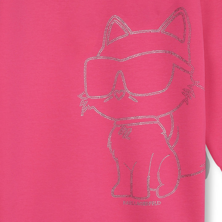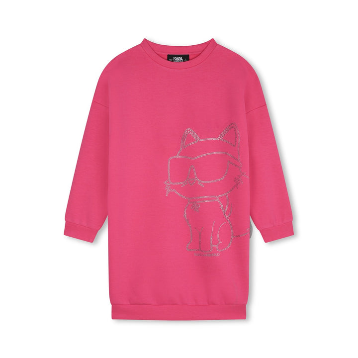 A fuchsia pink sweatshirt dress for girls by KARL LAGERFELD KIDS, made in soft, comfortable, cotton blend jersey. Pulling on easily over the head, it is simply styled with a crew neckline and stretchy ribbed trims. Karl Lagerfeld's beloved cat Choupette can be seen on the front in sparkling silver diamantés, and a logo is printed on the back of the neck, both adding a stylish designer finish to this casual piece.